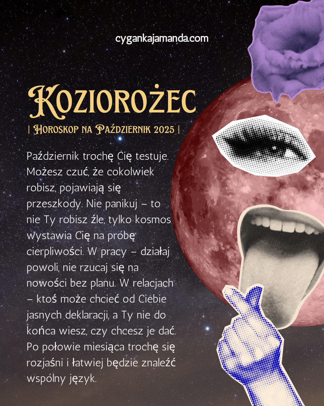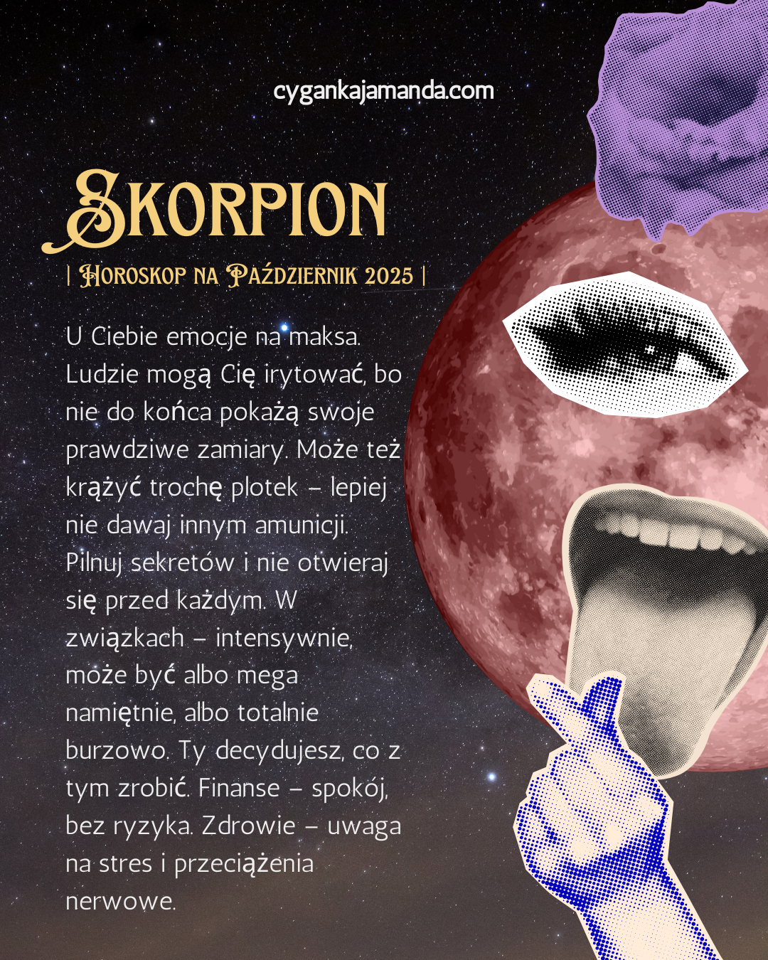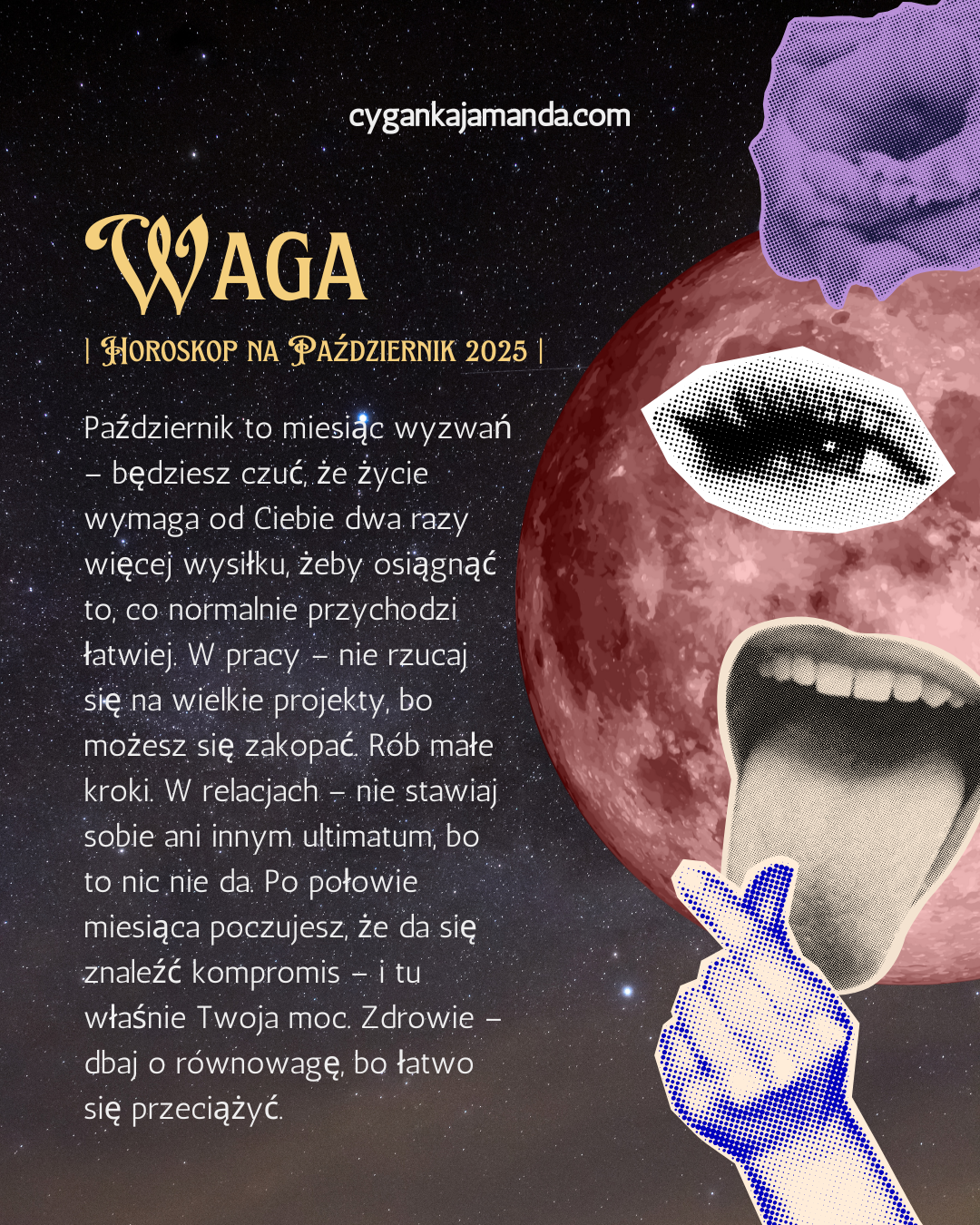 Pełnia w Baranie (7.10) podsyci odwagę i wybuchowe decyzje – uważaj, by nie przesadzić. Nów w Wadze (21.10) otworzy drzwi do nowych początków w relacjach i pomoże znaleźć równowagę. Pierwsza połowa miesiąca może być nerwowa i pełna napięć, ale po 15 października energia łagodnieje, a w trzeciej dekadzie sprawy zaczynają się układać. To czas testów, cięć i nowych startów – kto przetrwa chaos, ten wejdzie w listopad silniejszy i bardziej świadomy. 🌕🌑